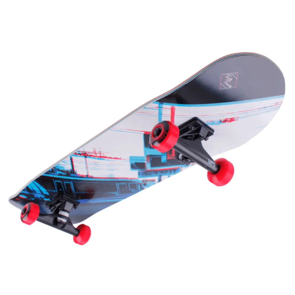 Основной материал изготовления – натуральное дерево. Поверхность скейта оформлена наждачкой. Нескользящая поверхность исключает скольжение, обеспечивает устойчивость и удобство управления в форм-мажорных ситуациях. Колесная часть – полиуретановая, обеспечивает отличный накат и скорость.